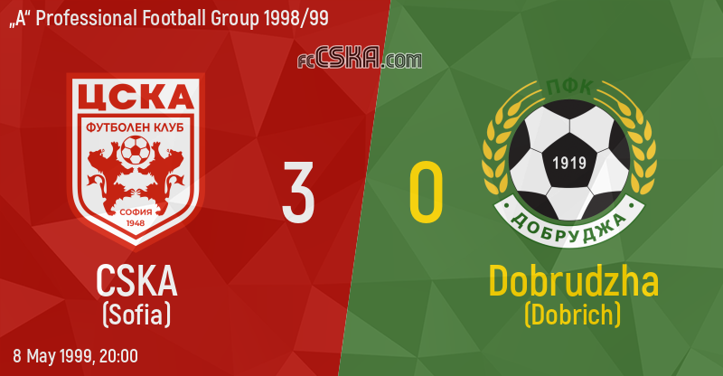 CSKA won against Dobrudzha (Dobrich) with result 3:0 in match from 27th round of „А“ Professional Football Group 1998/99 played on 8 May 1999 at 20:00 on „Bulgarska armia“ stadium, in Sofia. goalscorers for the army men were Stilian Petrov (57′), Dimitar Berbatov (59′) and Rumen Hristov (71′).