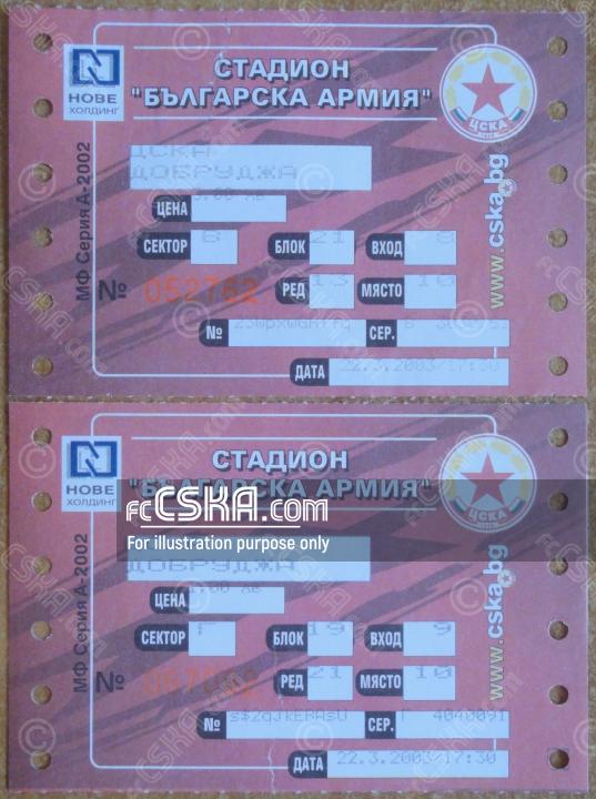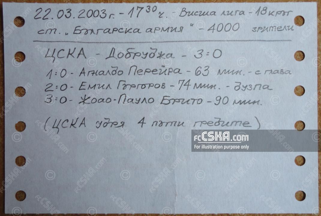 CSKA won against Dobrudzha (Dobrich) with result 3:0 in match from 18th round of Premier Professional Football League 2002/03 played on 22 March 2003 at 17:30 on „Bulgarska armia“ stadium, in Sofia. goalscorers for the army men were Agnaldo Pereira (63′), Emil Gargorov (76′ from penalty) and João Paulo Brito (90′).