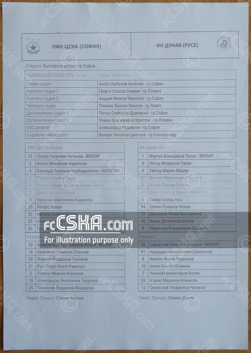 CSKA won against Dunav 2010 (Ruse) with result 3:0 in match from 19th round of First Professional League 2016/17 played on 16 December 2016 at 14:30 on „Bulgarska armia“ stadium, in Sofia. goalscorers for the army men were Rúben Pinto (60′), Bozhidar Chorbadzhiyski (88′) and Aleksandar Dyulgerov (94′).