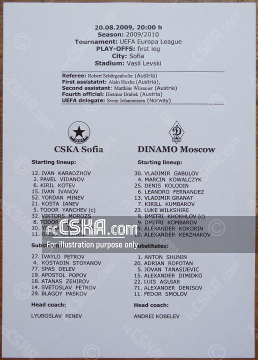 CSKA draw against Dynamo (Moscow) with result 0:0 in match from Play-off — First Leg of Europa League 2009/10 played on 20 August 2009 at 20:00 on „Vasil Levski“ stadium, in Sofia.