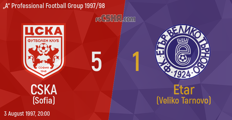 CSKA won against Etar (Veliko Tarnovo) with result 5:1 in match from 1st round of „А“ Professional Football Group 1997/98 played on 3 August 1997 at 20:00 on „Bulgarska armia“ stadium, in Sofia. goalscorers for the army men were Božidar Đurković (6′), Metodi Deyanov (10′), Ivaylo Andonov (15′ and 50′) and Emil Kremenliev (68′).