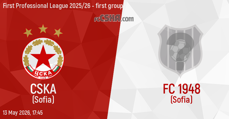 CSKA will play with FC 1948 in match from 34th round of First Professional League 2025/26 - first group on 13 May 2026 at 17:45 on „Vasil Levski“ stadium, in Sofia. the match will translated live on „Diema sport”.