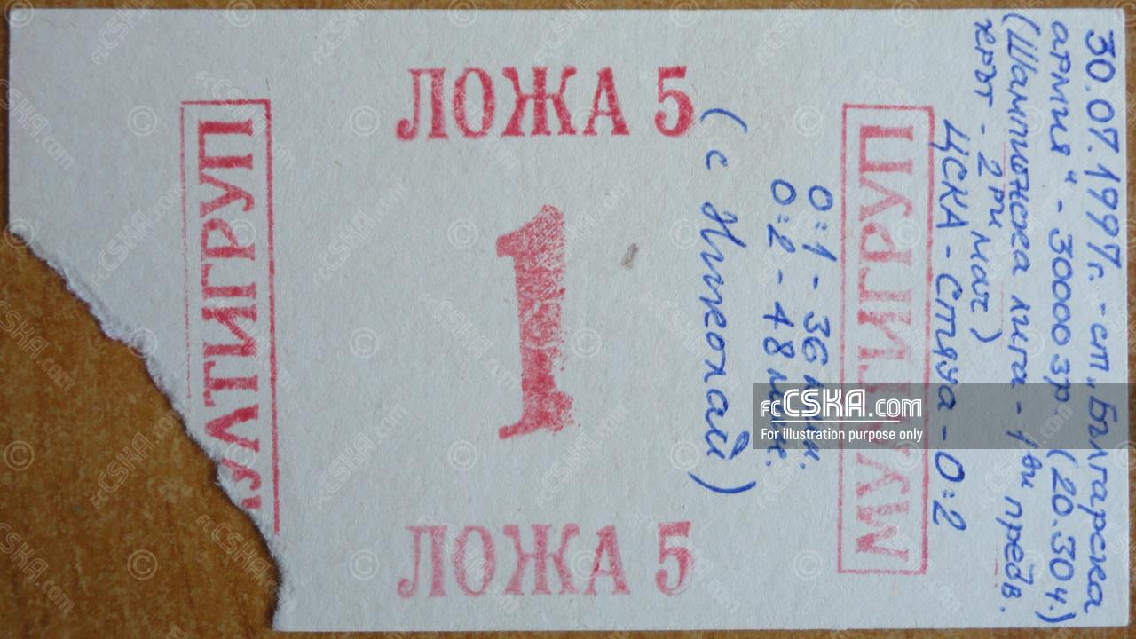 CSKA lost against FC Steaua (București) with result 0:2 in match from I preliminary round — Second Leg of Champions League 1997/98 played on 30 July 1997 at 20:30 on „Bulgarska armia“ stadium, in Sofia.