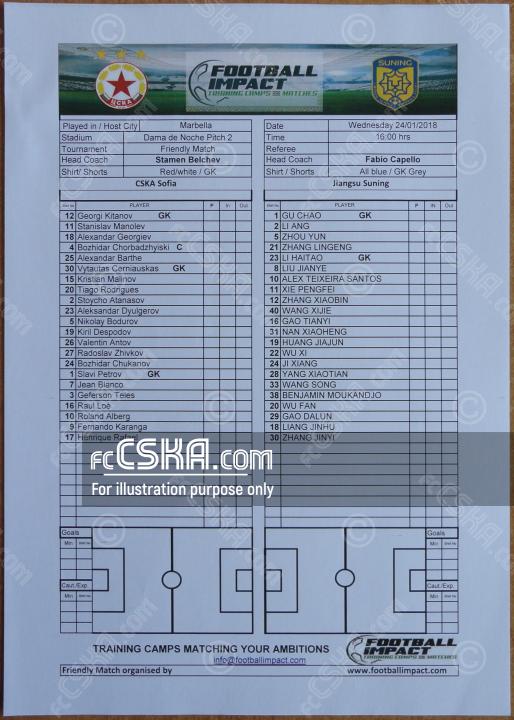 CSKA won against Jiangsu Suning FC (Nanjing) with result 8:0 in match from Friendly games 2017/18 played on 24 January 2018 at 17:00 goalscorers for the army men were Kiril Despodov (17′, 65′ from penalty and 68′), Fernando Karanga (35′), Roland Alberg (42′), Radoslav Zhivkov (85′), Stoycho Atanasov (88′) and Stanislav Manolev (89′ from penalty).