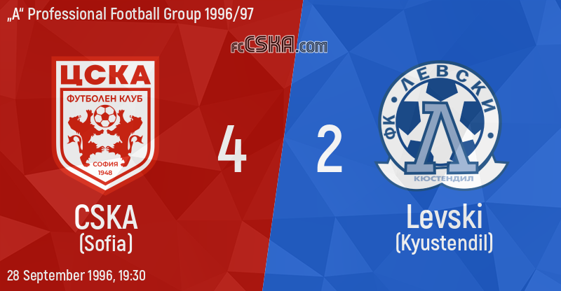 CSKA won against Levski (Kyustendil) with result 4:2 in match from 7th round of „А“ Professional Football Group 1996/97 played on 28 September 1996 at 19:30 on „Bulgarska armia“ stadium, in Sofia. goalscorers for the army men were Riste Milosavov (29′), Petar Zhabov (38′ and 70′) and Nikolay Nikolov (80′).