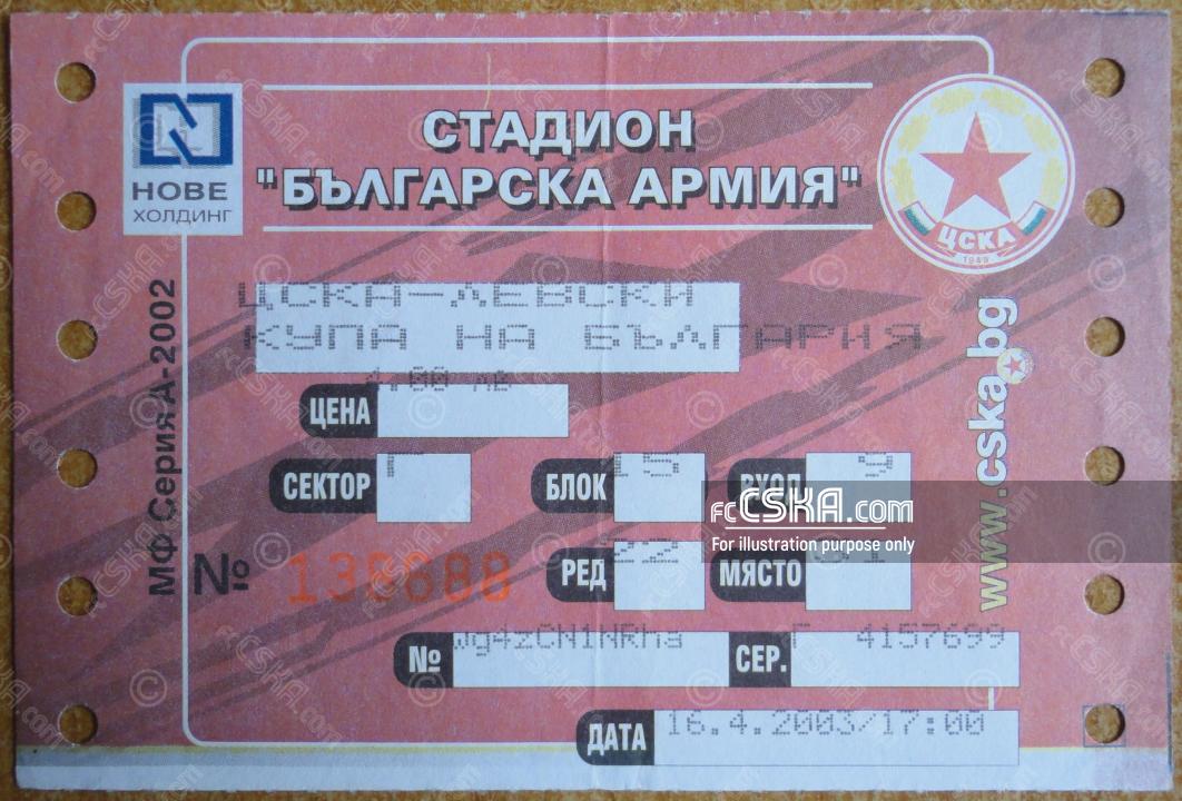 CSKA lost against Levski (Sofia) with result 0:1 in match from Semifinals — First Leg of Cup of Bulgaria 2002/03 played on 16 April 2003 at 17:00 on „Bulgarska armia“ stadium, in Sofia.