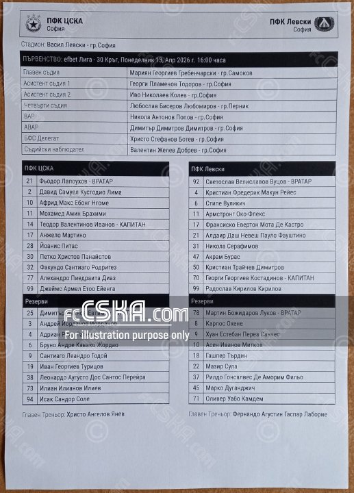CSKA draw against Levski (Sofia) with result 1:1 in match from 30th round of First Professional League 2025/26 played on 13 April 2026 at 16:00 on „Vasil Levski“ stadium, in Sofia. goalscorer for the army men was Leandro Godoy (94′).