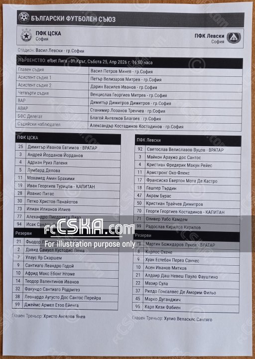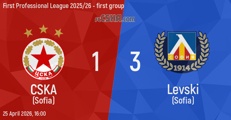 CSKA lost against Levski (Sofia) with result 1:3 in match from 31st round of First Professional League 2025/26 - first group played on 25 April 2026 at 16:00 on „Vasil Levski“ stadium, in Sofia. Auto goal for the guests scored Kristian Makun[1] (11′).