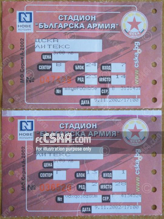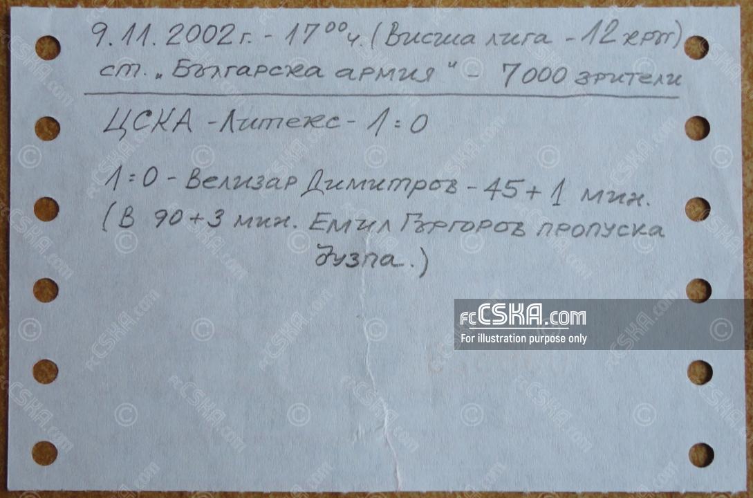 CSKA won against Litex (Lovech) with result 1:0 in match from 12th round of Premier Professional Football League 2002/03 played on 9 November 2002 at 17:00 on „Bulgarska armia“ stadium, in Sofia. goalscorer for the army men was Velizar Dimitrov (45′).