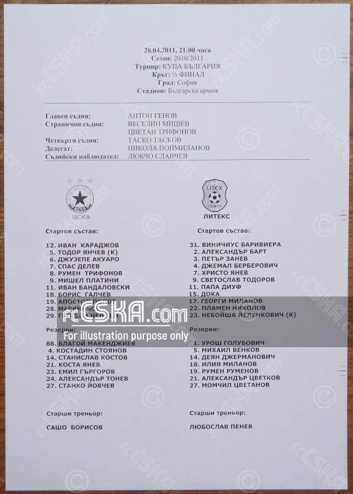 CSKA won against Litex (Lovech) with result 2:1 in match from Semifinals of Cup of Bulgaria 2010/11 played on 20 April 2011 at 21:00 on „Bulgarska armia“ stadium, in Sofia. goalscorer for the army men was Spas Delev (28′ and 87′).