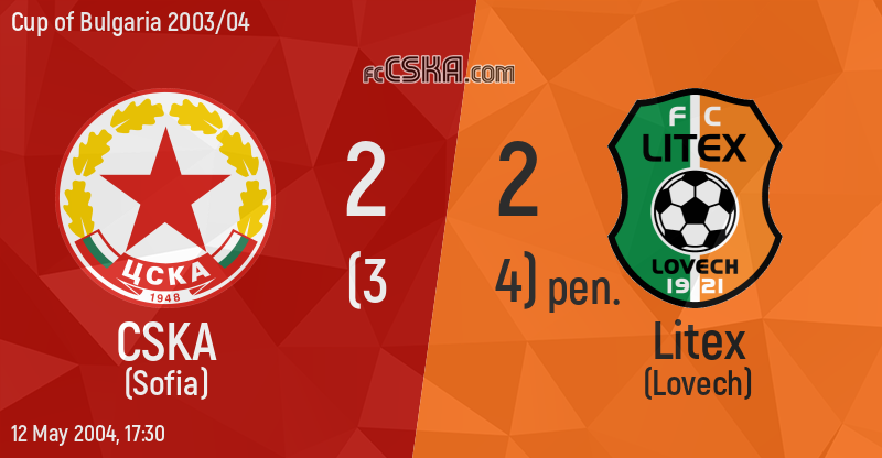 CSKA draw against Litex (Lovech) with result 2:2 in match from Final of Cup of Bulgaria 2003/04 played on 12 May 2004 at 17:30 on „Vasil Levski“ stadium, in Sofia. goalscorers for the army men were João Carlos (57′), Emil Gargorov (71′), Svetoslav Petrov (128′ from penalty), Velizar Dimitrov (128′ from penalty) and Marcos Charras (128′ from penalty).
