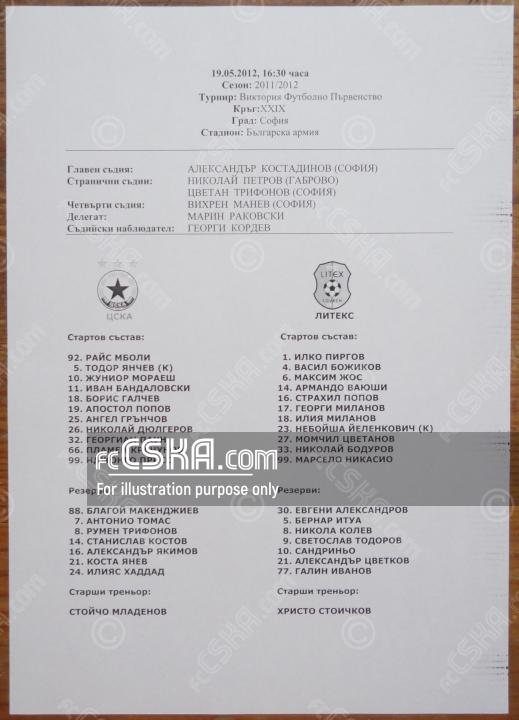CSKA won against Litex (Lovech) with result 4:1 in match from 29th round of „А“ Football Group 2011/12 played on 19 May 2012 at 16:30 on „Bulgarska armia“ stadium, in Sofia. goalscorers for the army men were Júnior Moraes (25′, 38′ and 47′) and Plamen Krachunov (64′).