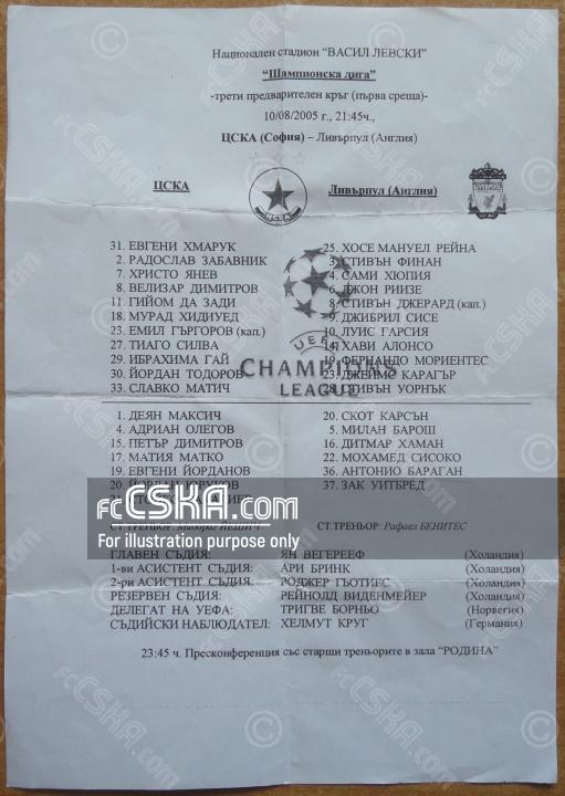 CSKA lost against Liverpool F.C. with result 1:3 in match from III preliminary round — First Leg of Champions League 2005/06 played on 10 August 2005 at 21:45 on „Vasil Levski“ stadium, in Sofia. goalscorer for the army men was Velizar Dimitrov (45′).