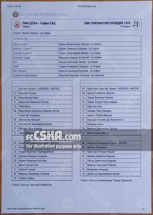 CSKA lost against Lokomotiv 1926 (Plovdiv) with result 1:2 in match from 27th round of First Professional League 2023/24 played on 3 April 2024 at 17:00 on „Vasil Levski“ stadium, in Sofia. goalscorer for the army men was Danilo Asprilla (73′).