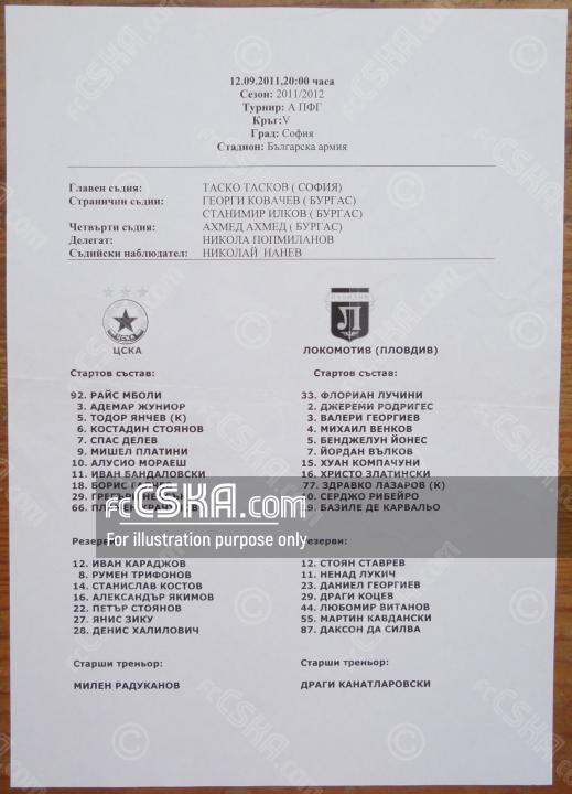 CSKA won against Lokomotiv 1926 (Plovdiv) with result 3:0 in match from 5th round of „А“ Football Group 2011/12 played on 12 September 2011 at 20:00 on „Bulgarska armia“ stadium, in Sofia. goalscorers for the army men were Michel Platini (19′), Júnior Moraes (36′ from penalty) and Spas Delev (66′).