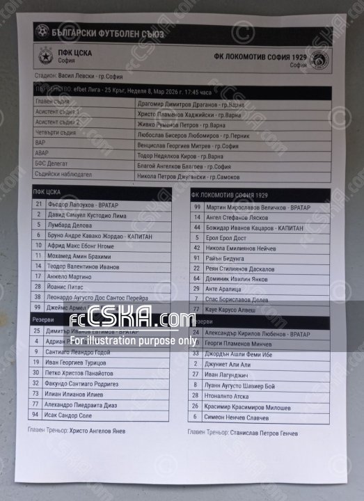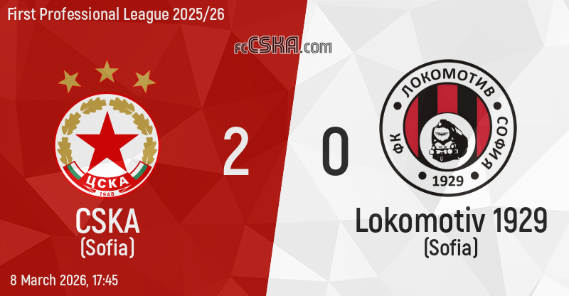CSKA won against Lokomotiv 1929 (Sofia) with result 2:0 in match from 25th round of First Professional League 2025/26 played on 8 March 2026 at 17:45 on „Vasil Levski“ stadium, in Sofia. goalscorers for the army men were James Eto'o (13′) and Alejandro Piedrahita (81′).