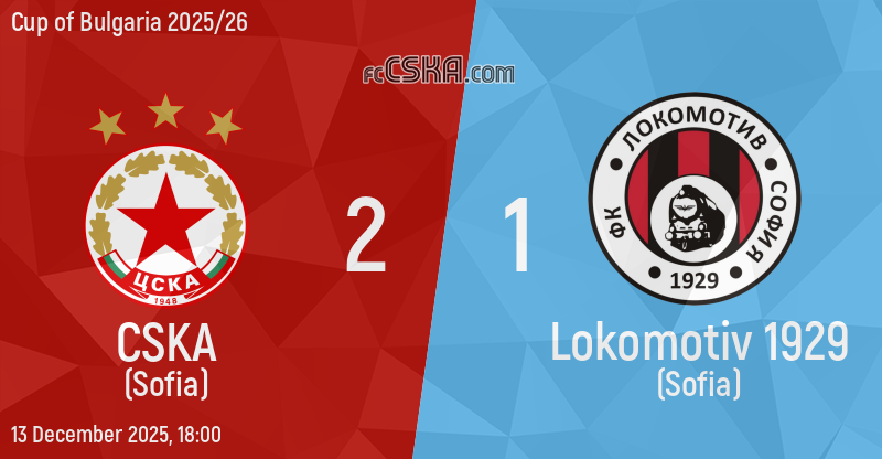 CSKA won against Lokomotiv 1929 (Sofia) with result 2:1 in match from Round of 16 — third round of Cup of Bulgaria 2025/26 played on 13 December 2025 at 18:00 on „Vasil Levski“ stadium, in Sofia. goalscorer for the army men was Bruno Jordão (69′). Auto goal for the guests scored Sadio Dembele[1] (29′).