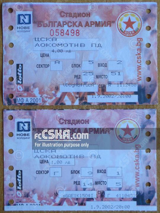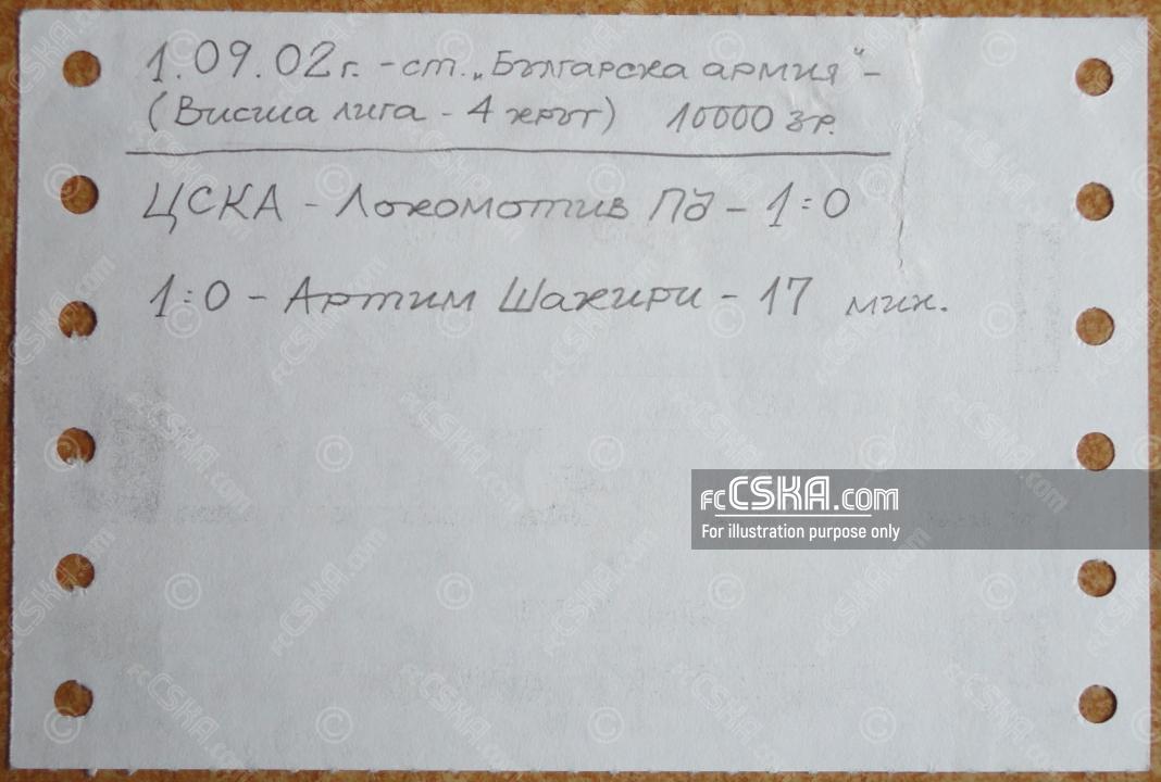 CSKA won against Lokomotiv 1936 (Plovdiv) with result 1:0 in match from 4th round of Premier Professional Football League 2002/03 played on 1 September 2002 at 20:00 on „Bulgarska armia“ stadium, in Sofia. goalscorer for the army men was Artim Shakiri (17′).