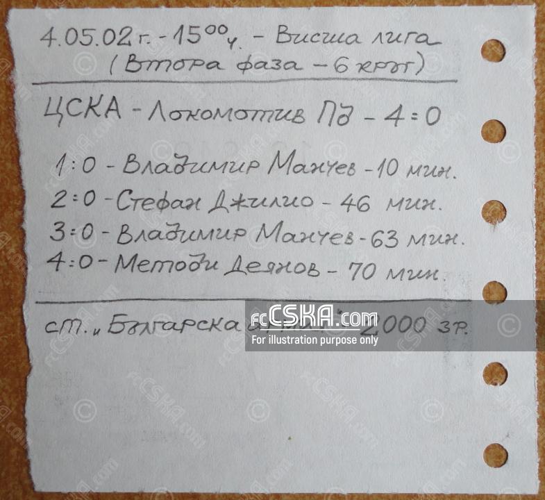 CSKA won against Lokomotiv 1936 (Plovdiv) with result 4:0 in match from 6th round of Premier League 2001/02 - first group played on 4 May 2002 at 15:00 on „Bulgarska armia“ stadium, in Sofia. goalscorers for the army men were Vladimir Manchev (10′ and 63′), Stefan Giglio (46′) and Metodi Deyanov (70′).