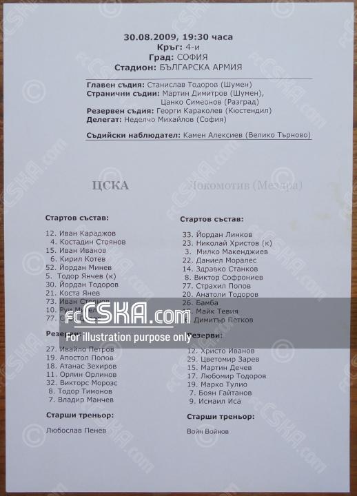 CSKA won against Lokomotiv (Mezdra) with result 4:0 in match from 4th round of „А“ Football Group 2009/10 played on 30 August 2009 at 19:30 on „Bulgarska armia“ stadium, in Sofia. goalscorers for the army men were Yordan Todorov (17′), Ivan Stoyanov (26′ and 77′ from penalty) and Vladimir Manchev (69′).