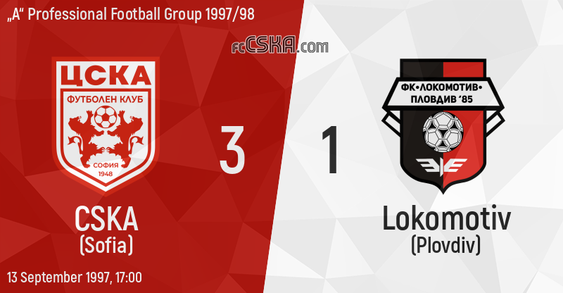 CSKA won against Lokomotiv (Plovdiv) with result 3:1 in match from 6th round of „А“ Professional Football Group 1997/98 played on 13 September 1997 at 17:00 on „Bulgarska armia“ stadium, in Sofia. goalscorers for the army men were Dobromir Mitov (5′), Metodi Deyanov (45′) and Petar Zhabov (49′).
