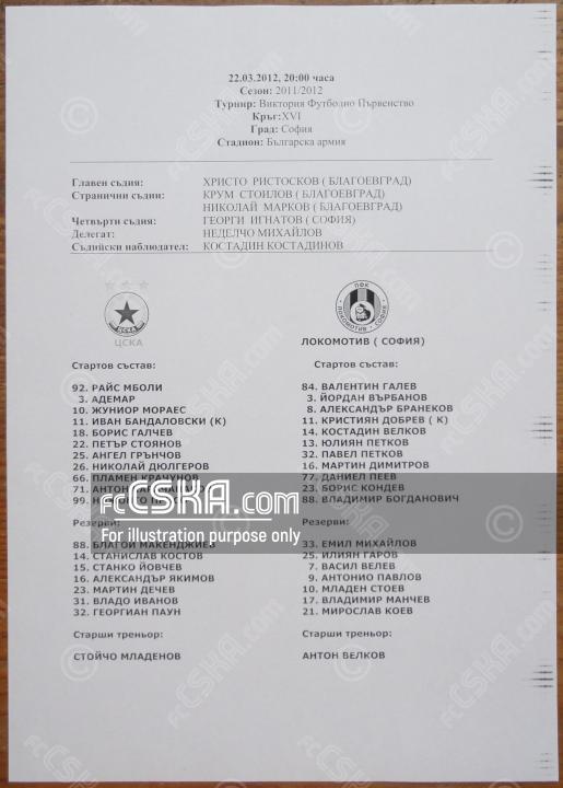 CSKA won against Lokomotiv (Sofia) with result 4:0 in match from 16th round of „А“ Football Group 2011/12 played on 22 March 2012 at 20:00 on „Bulgarska armia“ stadium, in Sofia. goalscorers for the army men were Anton Karachanakov (28′), Njongo Priso (76′), Ivan Bandalovski (82′) and Júnior Moraes (85′).