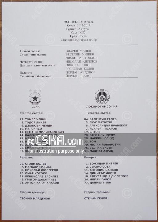 CSKA won against Lokomotiv (Sofia) with result 5:0 in match from 19th round of „А“ Football Group 2013/14 played on 30 November 2013 at 15:15 on „Bulgarska armia“ stadium, in Sofia. goalscorers for the army men were Martin Petrov (12′ and 41′), Ivaylo Chochev (35′), Marcinho (49′) and Emil Gargorov (73′).