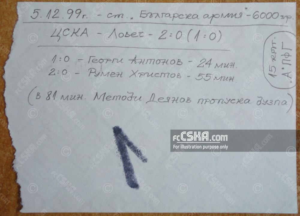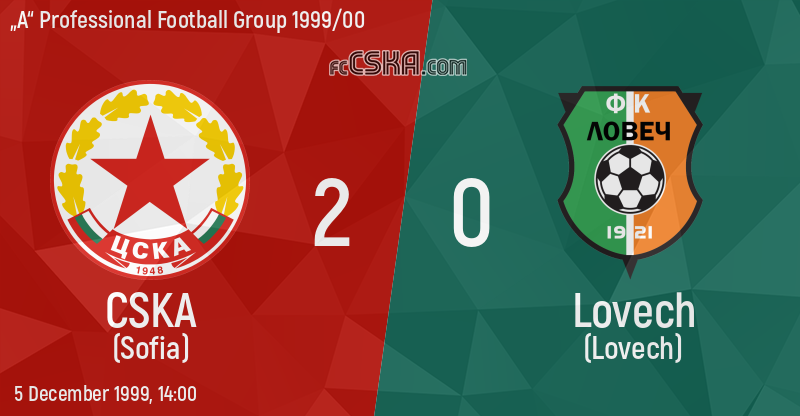 CSKA won against Lovech (Lovech) with result 2:0 in match from 15th round of „А“ Professional Football Group 1999/00 played on 5 December 1999 at 14:00 on „Bulgarska armia“ stadium, in Sofia. goalscorers for the army men were Georgi Antonov (23′) and Rumen Hristov (56′).