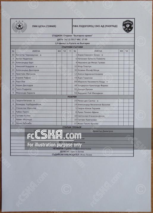 CSKA won against Ludogorets 1945 (Razgrad) with result 2:1 in match from Quarterfinal of Cup of Bulgaria 2017/18 played on 14 December 2017 at 17:30 on „Bulgarska armia“ stadium, in Sofia. goalscorers for the army men were Nikolay Bodurov (9′) and Kiril Despodov (96′).
