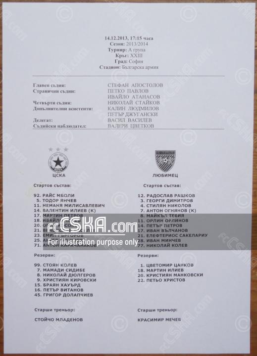CSKA won against Lyubimets 2007 (Lyubimets) with result 7:0 in match from 23rd round of „А“ Football Group 2013/14 played on 14 December 2013 at 17:15 on „Bulgarska armia“ stadium, in Sofia. goalscorers for the army men were Omar Kossoko (6′), Anton Karachanakov (14′ and 53′), Emil Gargorov (45′), Ventsislav Vasilev (51′), Grigor Dolapchiev (61′) and Ivaylo Chochev (67′).