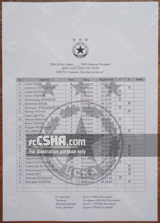 CSKA won against Maritsa 1921 (Plovdiv) with result 3:1 in match from Friendly games 2015/16 played on 22 July 2015 at 19:00 on „Bulgarska armia“ stadium, in Sofia. goalscorers for the army men were Vladislav Uzunov (18′), Kostadin Hazurov (49′) and Nikolay Tsvetkov (91′).