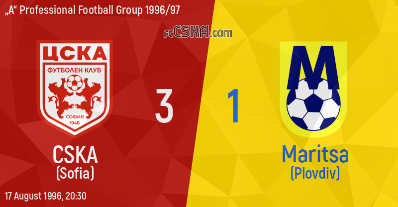 CSKA won against Maritsa (Plovdiv) with result 3:1 in match from 2nd round of „А“ Professional Football Group 1996/97 played on 17 August 1996 at 20:30 on „Bulgarska armia“ stadium, in Sofia. goalscorers for the army men were Ilia Voynov (28′ from penalty), Dobromir Mitov (56′) and Dimitar Ivanov (70′).