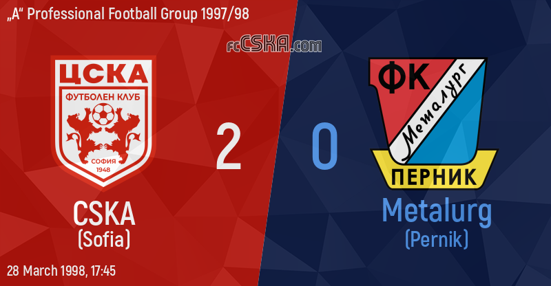 CSKA won against Metalurg (Pernik) with result 2:0 in match from 22nd round of „А“ Professional Football Group 1997/98 played on 28 March 1998 at 17:45 on „Bulgarska armia“ stadium, in Sofia. goalscorers for the army men were Boncho Genchev (15′) and Anton Bachev (45′).