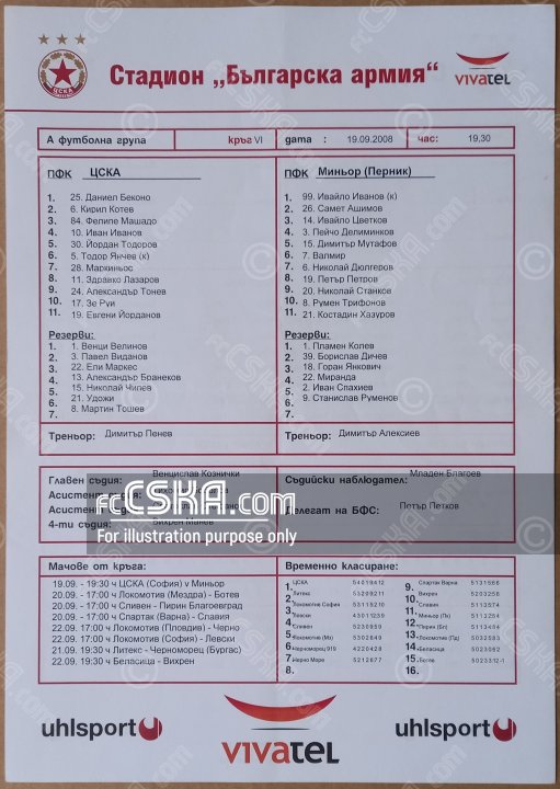 CSKA won against Minyor (Pernik) with result 2:0 in match from 6th round of „А“ Football Group 2008/09 played on 19 September 2008 at 19:30 on „Bulgarska armia“ stadium, in Sofia. goalscorers for the army men were Yordan Todorov (20′) and Ivan K. Ivanov (59′).