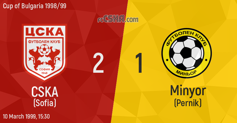 CSKA won against Minyor (Pernik) with result 2:1 in match from Quarterfinal — First Leg of Cup of Bulgaria 1998/99 played on 10 March 1999 at 15:30 on „Bulgarska armia“ stadium, in Sofia. goalscorers for the army men were Adalbert Zafirov (5′ from penalty) and Dimitar Berbatov (74′).