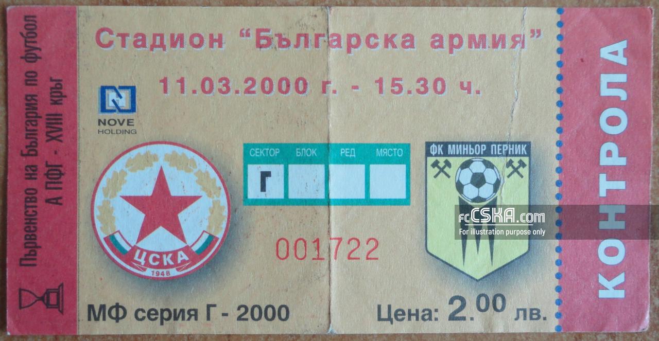 CSKA won against Minyor (Pernik) with result 6:1 in match from 18th round of „А“ Professional Football Group 1999/00 played on 11 March 2000 at 15:30 on „Bulgarska armia“ stadium, in Sofia. goalscorers for the army men were Svetoslav Petrov (2′), Dimitar Ivanov (17′ and 52′), Krasimir Chomakov (20′ and 43′) and Dimitar Berbatov (55′).