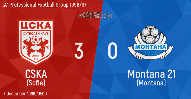 CSKA won against Montana 21 (Montana) with result 3:0 in match from 15th round of „А“ Professional Football Group 1996/97 played on 7 December 1996 at 16:00 on „Bulgarska armia“ stadium, in Sofia. goalscorers for the army men were Kostadin Vidolov (4′), Anatoli Nankov (13′) and Milen Petkov (16′ from penalty).