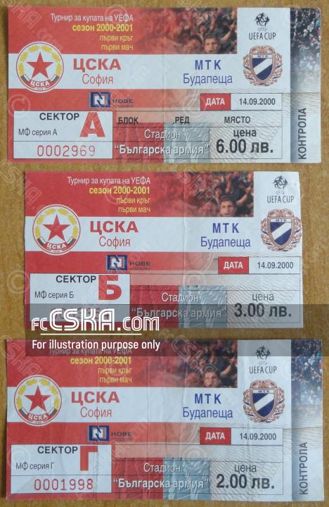CSKA lost against MTK (Budapest) with result 1:2 in match from First round — First Leg of UEFA Cup 2000/01 played on 14 September 2000 on „Bulgarska armia“ stadium, in Sofia. goalscorer for the army men was Hristo Yanev (6′).