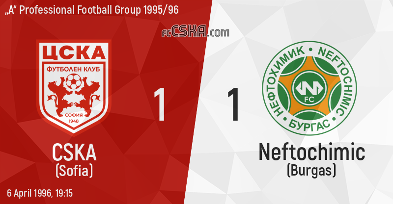 CSKA draw against Neftochimic (Burgas) with result 1:1 in match from 24th round of „А“ Professional Football Group 1995/96 played on 6 April 1996 at 19:15 on „Bulgarska armia“ stadium, in Sofia. goalscorer for the army men was Galin Ivanov (78′).