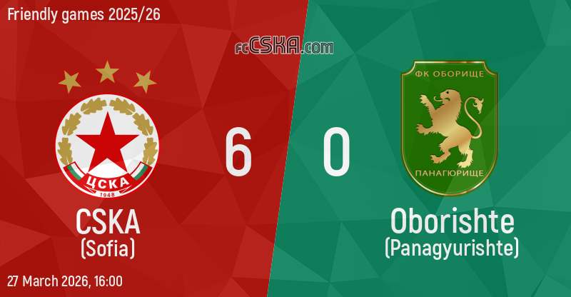 CSKA won against Oborishte (Panagyurishte) with result 6:0 in match from Friendly games 2025/26 played on 27 March 2026 at 16:00 on „CSKA Sports Complex“ stadium, in Pancharevo.