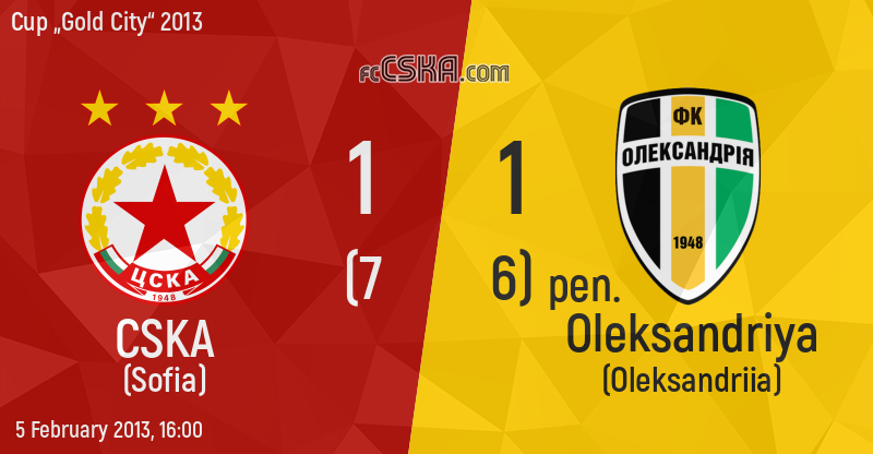 CSKA draw against Oleksandriya (Oleksandriia) with result 1:1 in match from Semifinals of Cup „Gold City“ 2013 played on 5 February 2013 at 16:00 on „Gold City “ stadium, in Alanya. goalscorers for the army men were Njongo Priso (89′ and 120′ from penalty), Stanko Yovchev (120′ from penalty), Ilias Kyriakidis (120′ from penalty), Ventsislav Vasilev (120′ from penalty), Petar I. Vitanov (120′ from penalty), Vasil Popov (120′ from penalty) and Ivaylo Chochev (120′ from penalty).