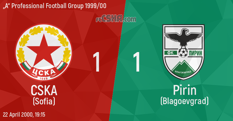 CSKA draw against Pirin (Blagoevgrad) with result 1:1 in match from 23rd round of „А“ Professional Football Group 1999/00 played on 22 April 2000 at 19:15 on „Bulgarska armia“ stadium, in Sofia. goalscorer for the army men was Vladimir Manchev (28′).