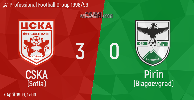 CSKA won against Pirin (Blagoevgrad) with result 3:0 in match from 21st round of „А“ Professional Football Group 1998/99 played on 7 April 1999 at 17:00 on „Bulgarska armia“ stadium, in Sofia. goalscorers for the army men were Milen Petkov (20′ and 74′ from penalty) and Valentin Stanchev (87′).