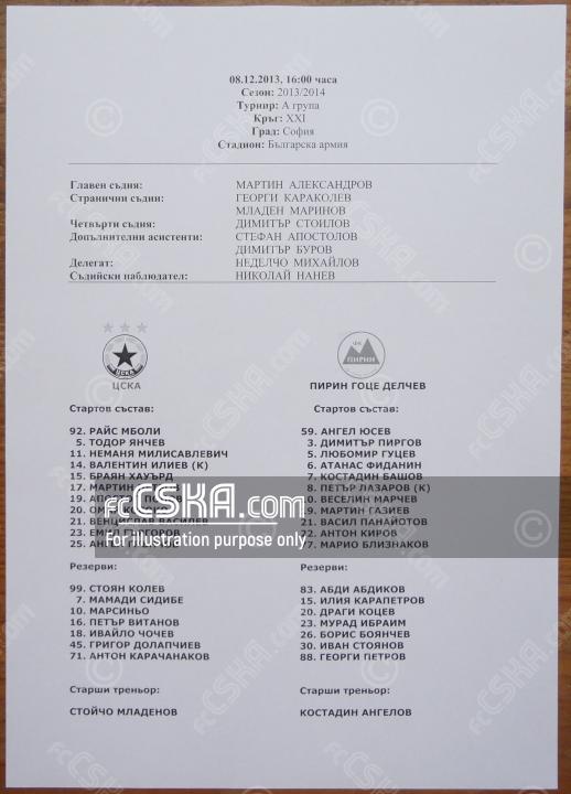 CSKA won against Pirin (Gotse Delchev) with result 2:0 in match from 21st round of „А“ Football Group 2013/14 played on 8 December 2013 at 16:00 on „Bulgarska armia“ stadium, in Sofia. goalscorers for the army men were Mamady Sidibé (55′) and Ivaylo Chochev (70′).