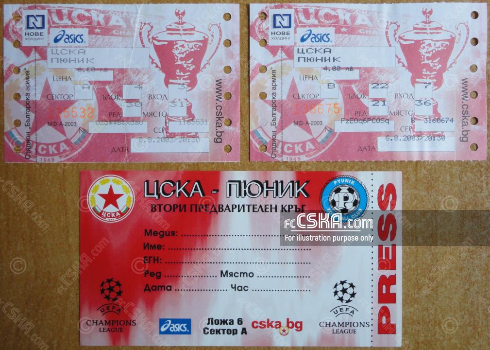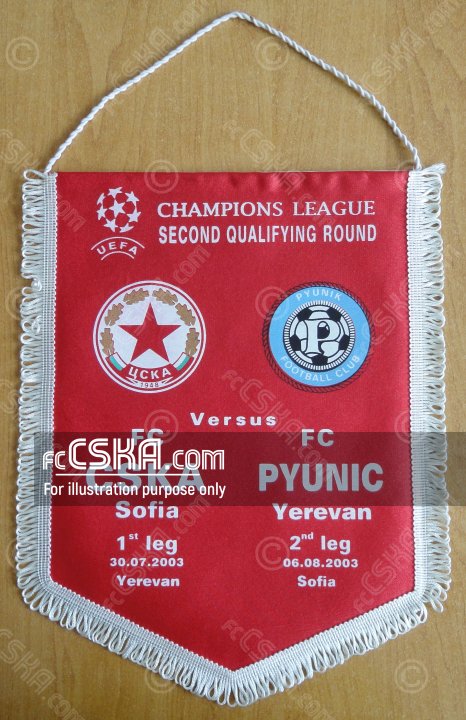 CSKA won against Pyunik (Yerevan) with result 1:0 in match from II preliminary round — Second Leg of Champions League 2003/04 played on 6 August 2003 at 20:30 on „Bulgarska armia“ stadium, in Sofia. goalscorer for the army men was Leonardo Lima (91′ from penalty).