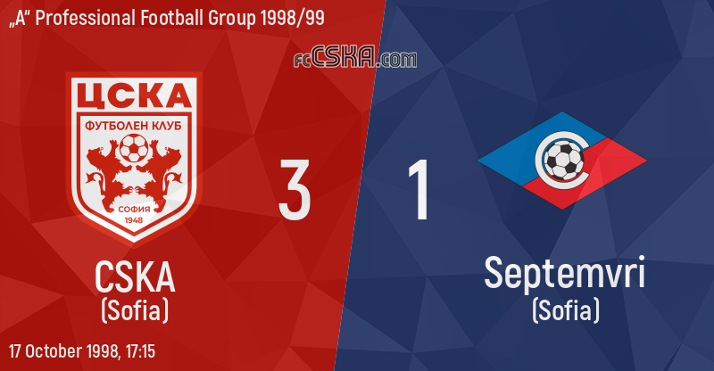 CSKA won against Septemvri (Sofia) with result 3:1 in match from 9th round of „А“ Professional Football Group 1998/99 played on 17 October 1998 at 17:15 on „Bulgarska armia“ stadium, in Sofia. goalscorers for the army men were Martin Petrov (4′), Georgi Yordanov (23′) and Rumen Hristov (83′).