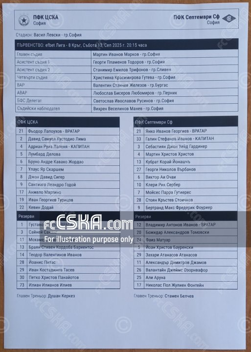 CSKA won against Septemvri (Sofia) with result 3:1 in match from 8th round of First Professional League 2025/26 played on 13 September 2025 at 20:15 on „Vasil Levski“ stadium, in Sofia. goalscorers for the army men were Lumbardh Dellova (10′), Petko Panayotov (94′) and Mohammed Brahimi (98′).