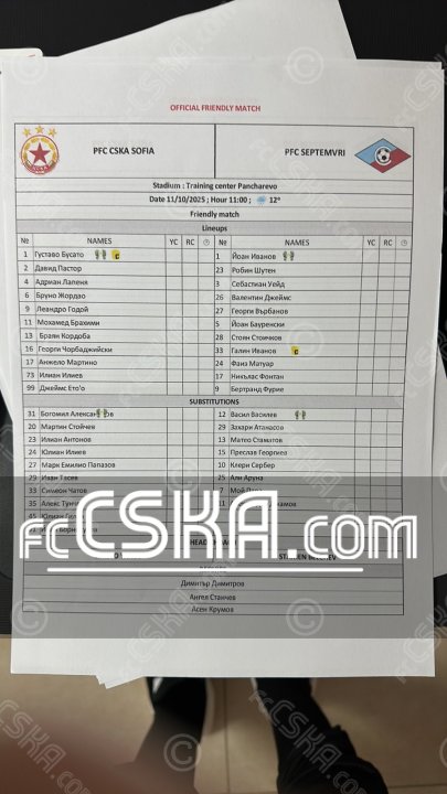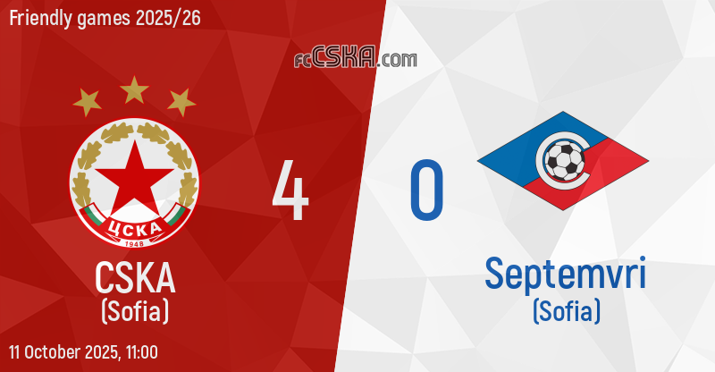 CSKA won against Septemvri (Sofia) with result 4:0 in match from Friendly games 2025/26 played on 11 October 2025 at 11:00 on „CSKA Sports Complex“ stadium, in Pancharevo. goalscorers for the army men were Leandro Godoy (14′), Georgi Chorbadzhiyski (27′) and Mohammed Brahimi (45′). Auto goal for the guests scored Robin Shuten[1] (24′).