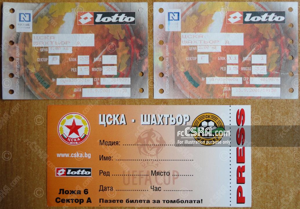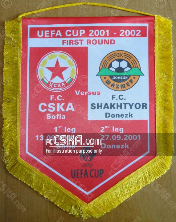CSKA won against Shakhter (Donetsk) with result 3:0 in match from First round — First Leg of UEFA Cup 2001/02 played on 20 September 2001 at 19:00 on „Bulgarska armia“ stadium, in Sofia. goalscorers for the army men were Vladimir Manchev (24′ and 78′) and Lyuboslav Penev (41′).