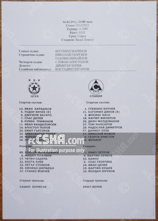 CSKA won against Slavia 1913 (Sofia) with result 1:0 in match from 22nd round of „А“ Football Group 2010/11 played on 16 April 2011 at 21:00 on „Vasil Levski“ stadium, in Sofia. goalscorer for the army men was Gergory Nelson (3′).